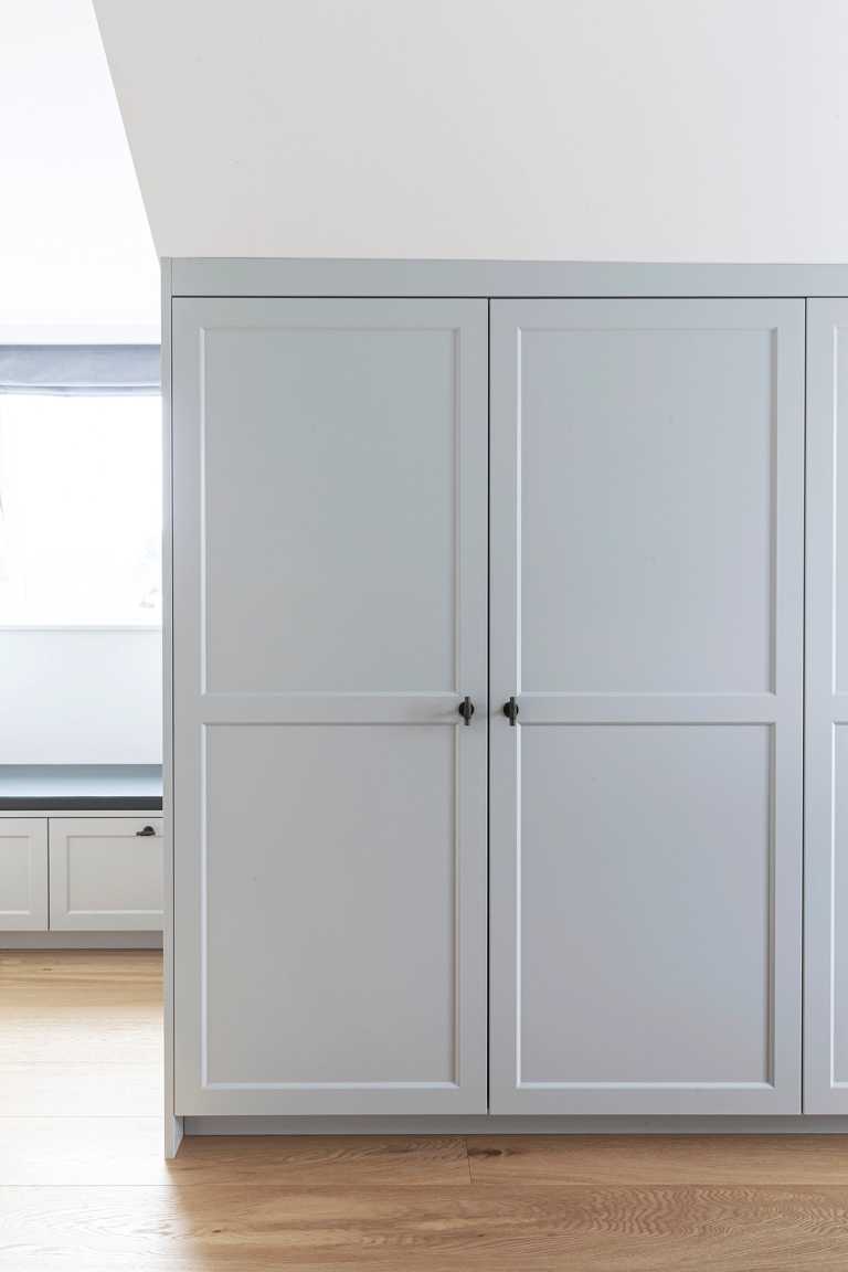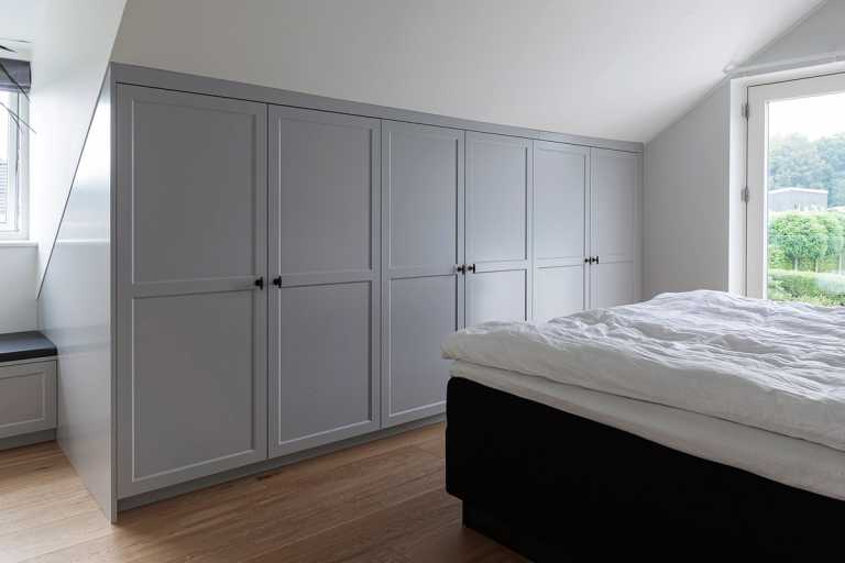 I soveværelset på 1. sal har vi udnyttet pladsen under skråvæggen til indbygget skabe samt lavet et siddemøbel med skuffer.