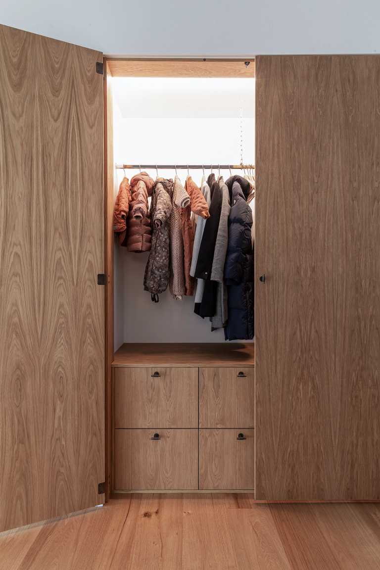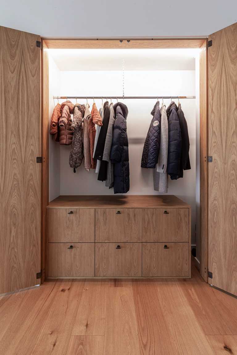 Indbygget skabslåger i entré med skuffer og bøjlestang indvendigt.