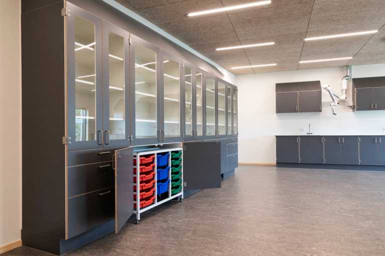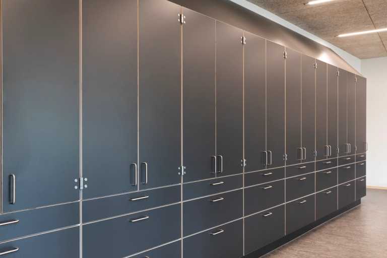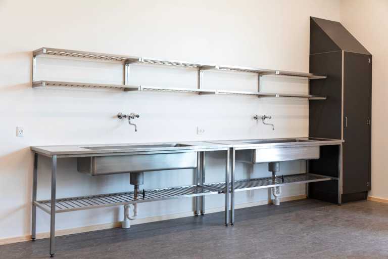 Opbevaringsskabe til faglokaler, stålborde med udslagsvaske samt garderober i krydsfinér.