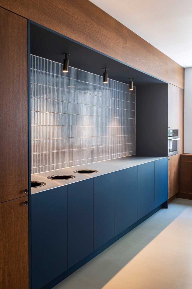 Bordplader er lavet i 5mm massiv stål med integreret vask samt huller til affaldssortering. På ø'en er er bordplader i 20mm terrazzo.