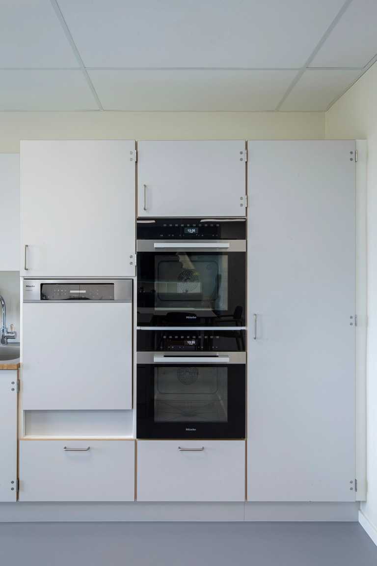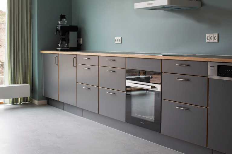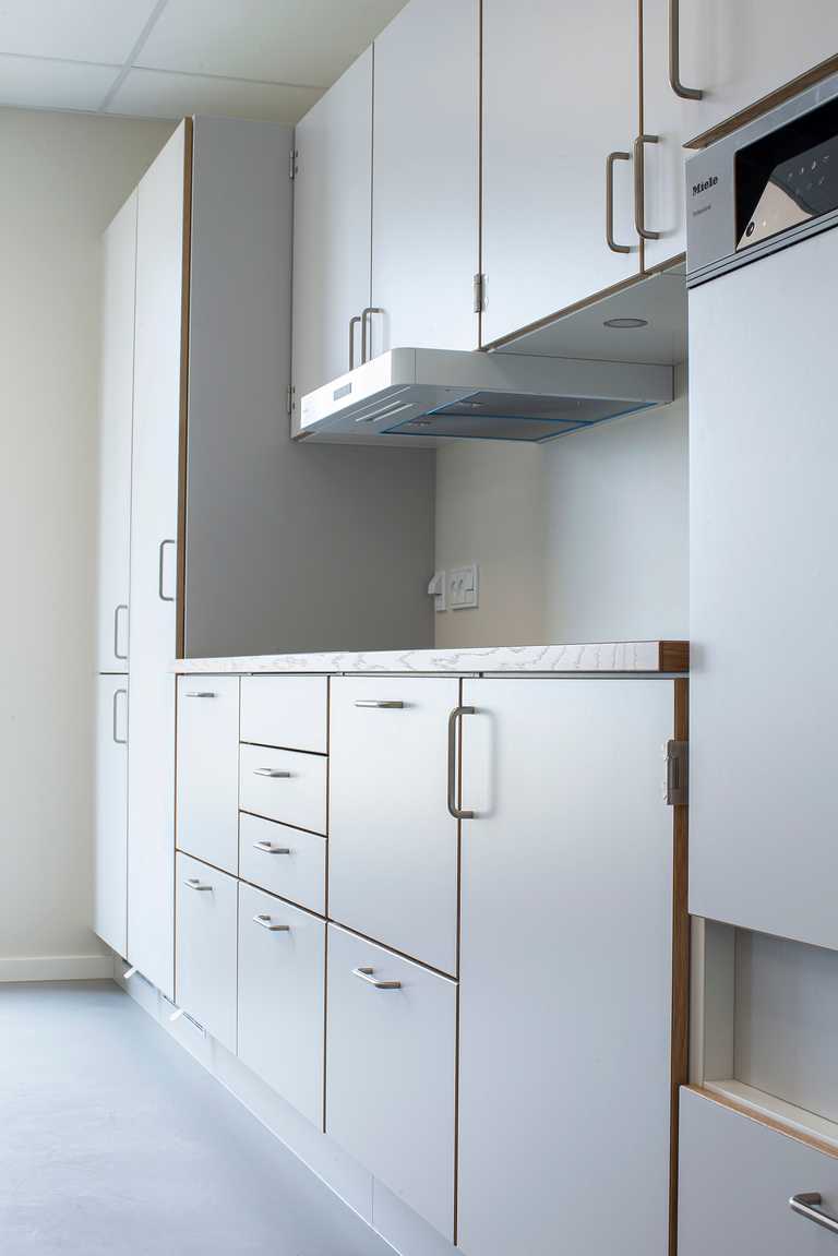 Alle fælles- og personale køkkener er leveret med vores unikke Kolon hængsel i rustfri stål, lågerne er udført i laminat med indlagt massiv egetræs kant.