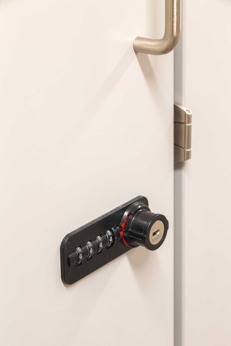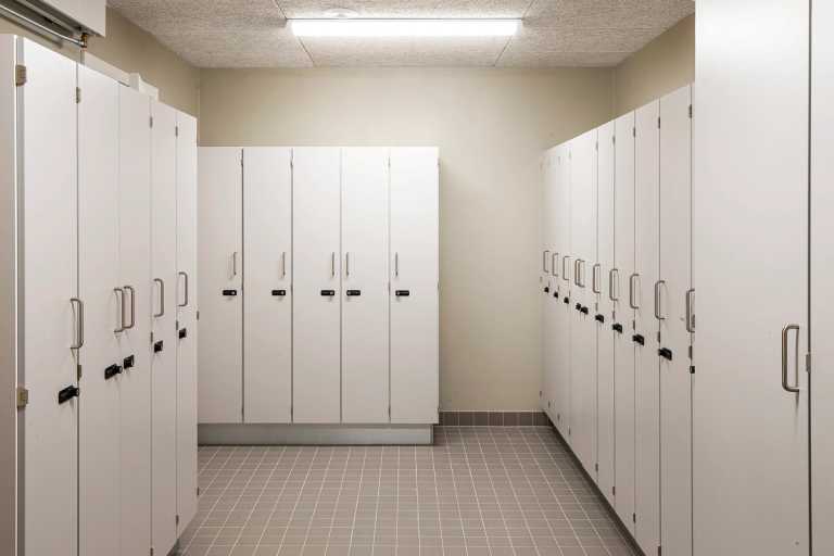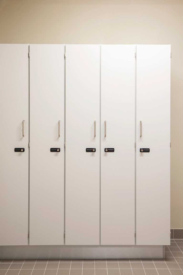 De 8 omklædningsrum er med låger i laminat med ABS-kant og med vores udvendige Aximat hængsel.