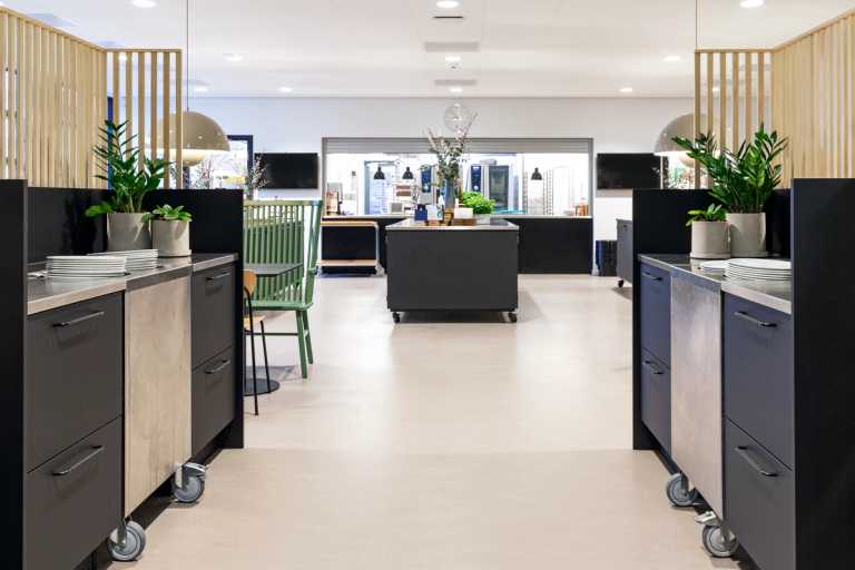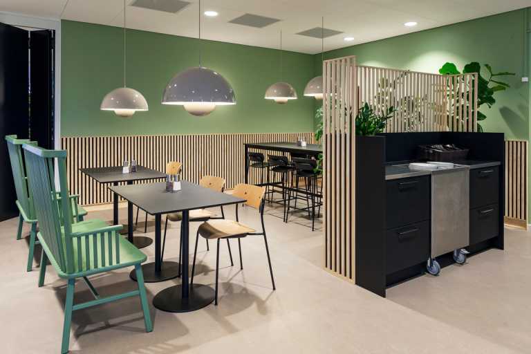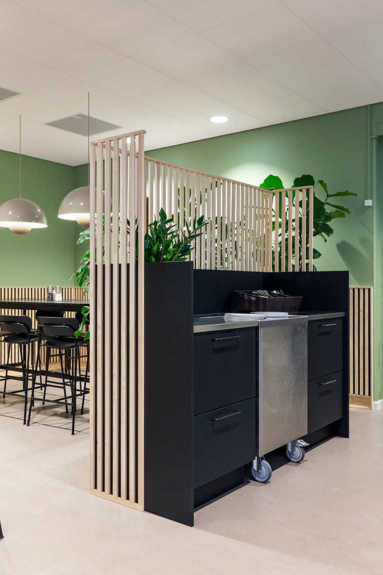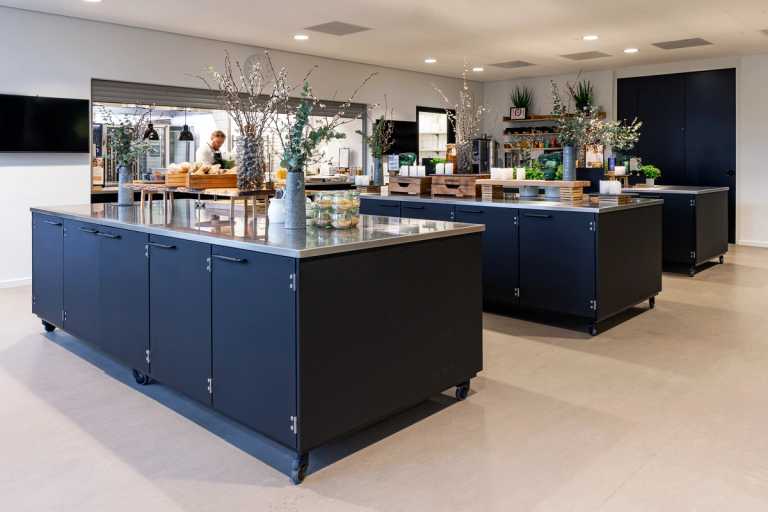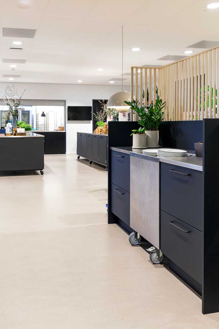 De store serveringsborde kan flyttes ved særlige lejligheder, giver god fleksibilitet i den stor kantine.