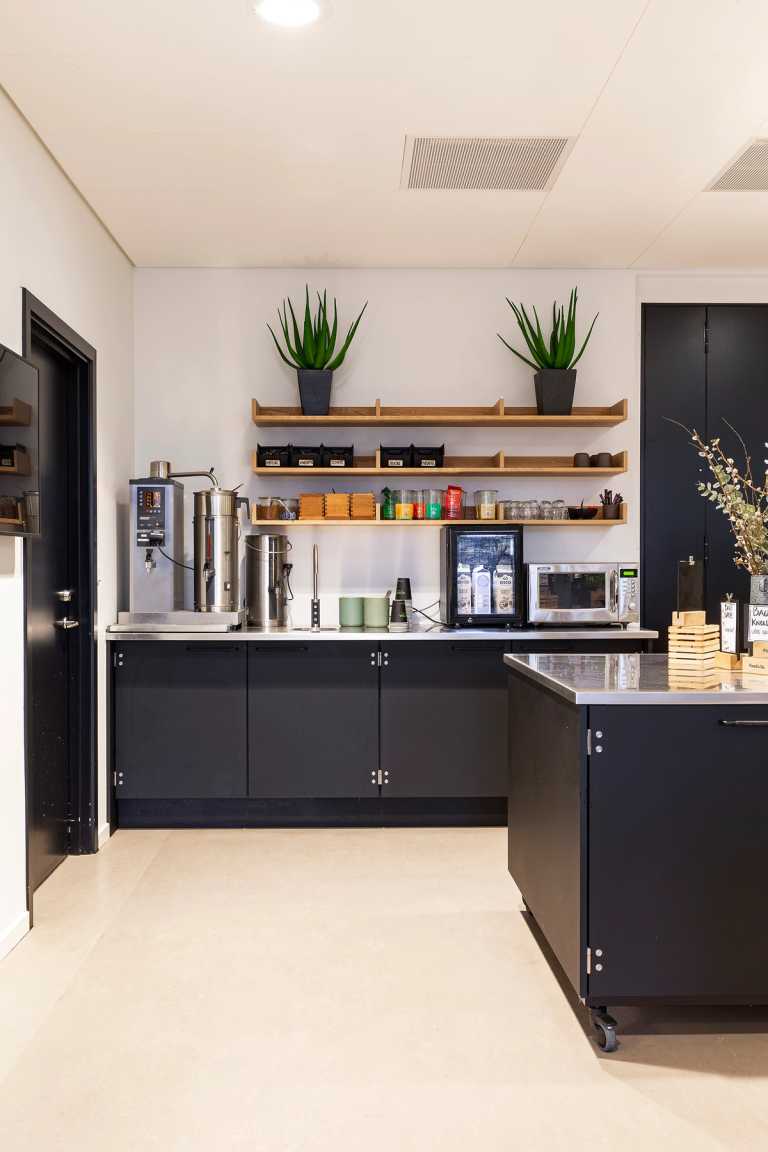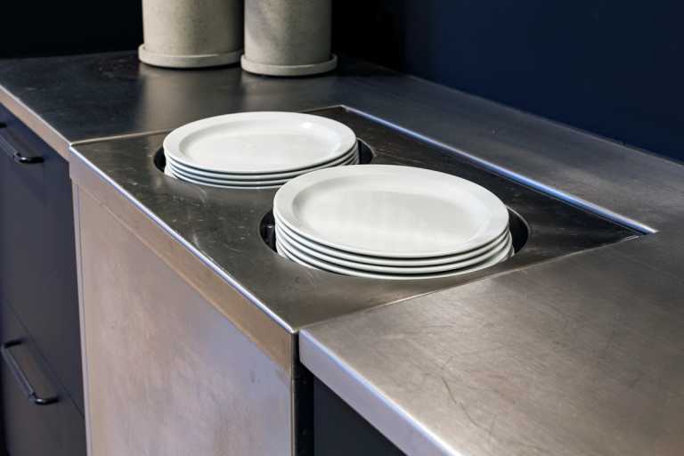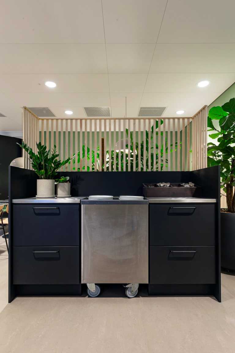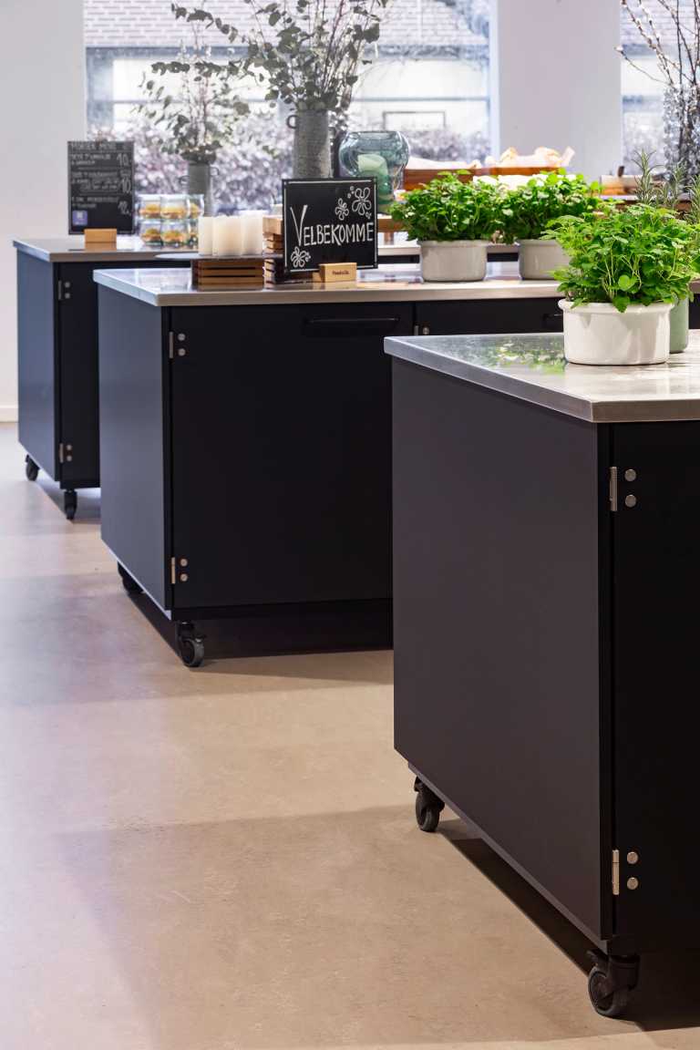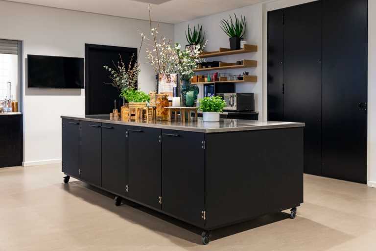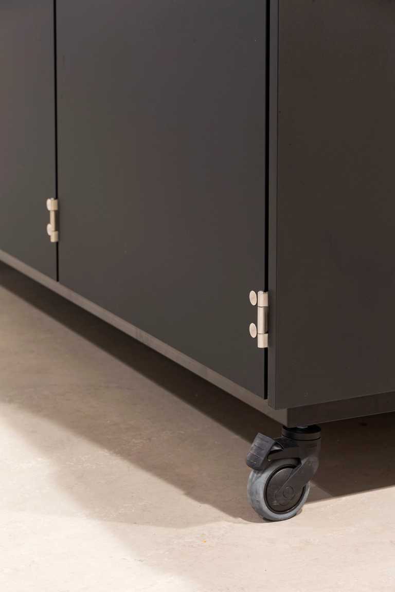 Inventaret er lavet i de den mat sort Fenix laminat og bordplader er i rustfri stål. Kolon hængslerne er ligeledes i rustfri stål.