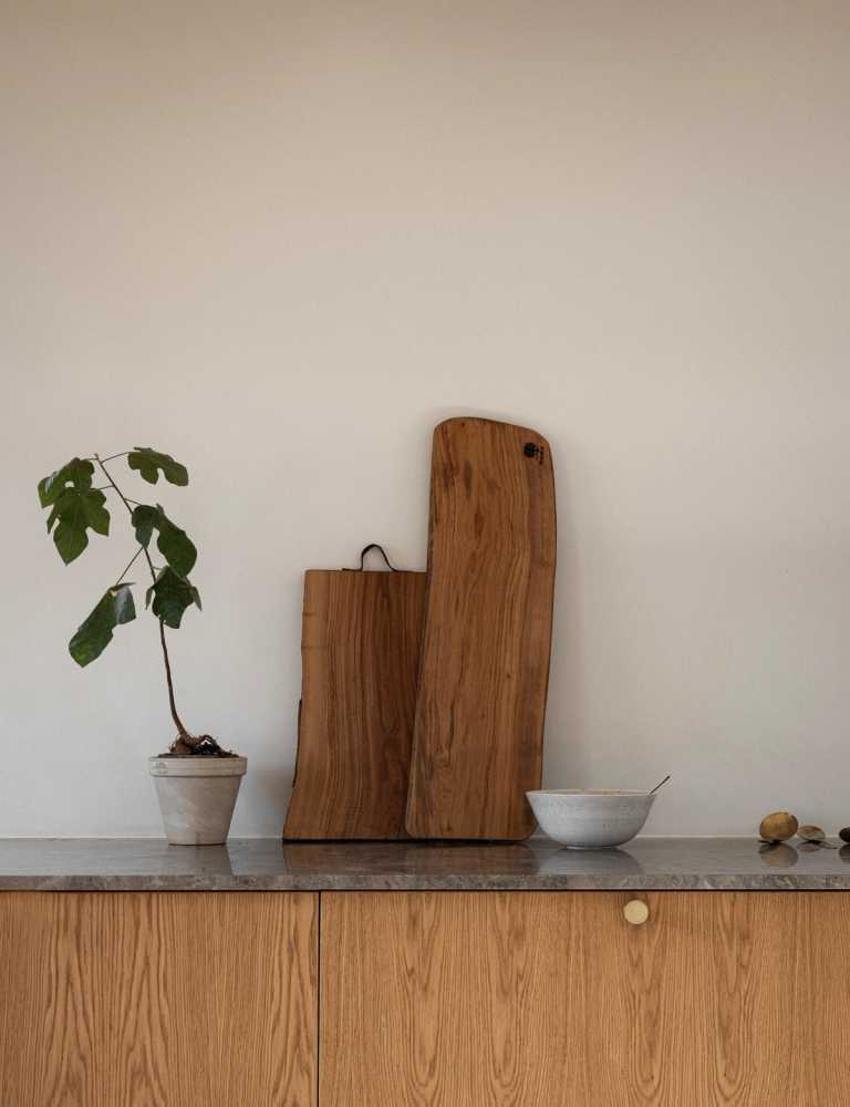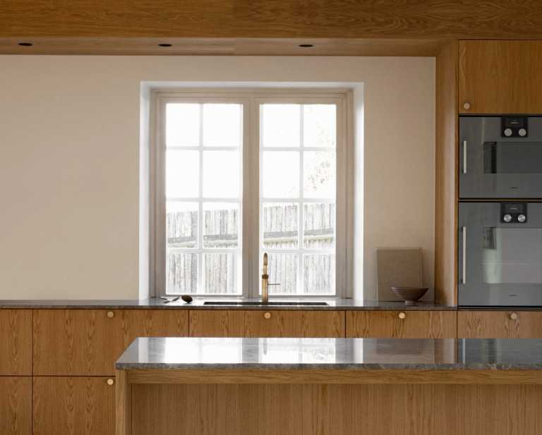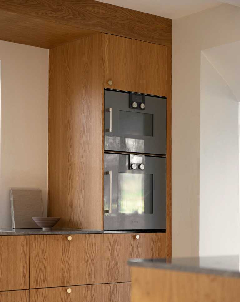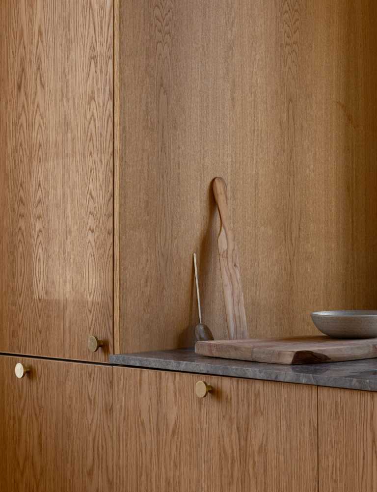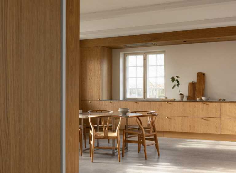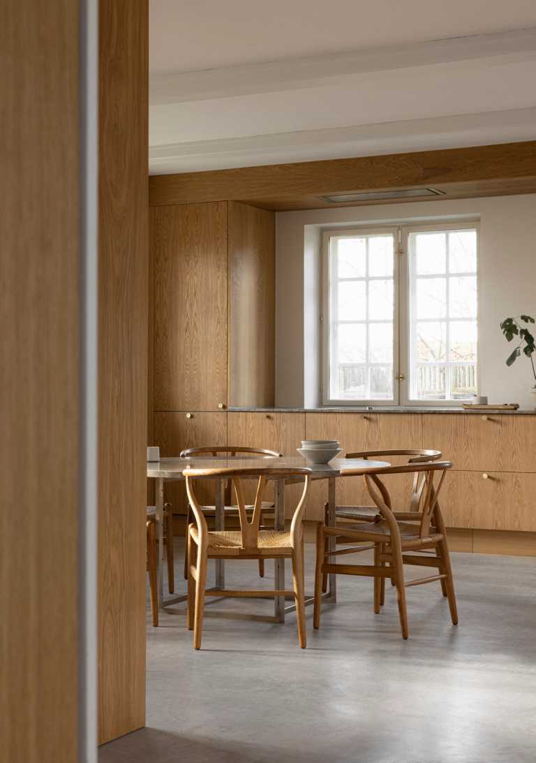 Gennemført villa der fuldender stilen med snedkerinventar i varme naturmaterialer