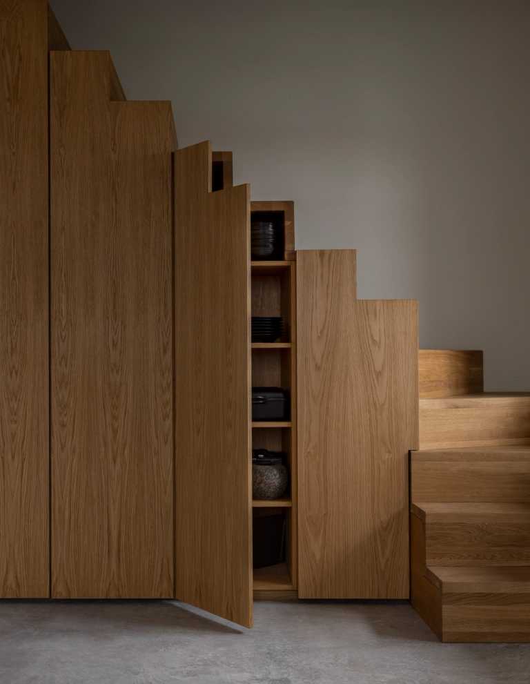 Køkken, bad og indbyggede skabe under trappe i natur olieret eg.