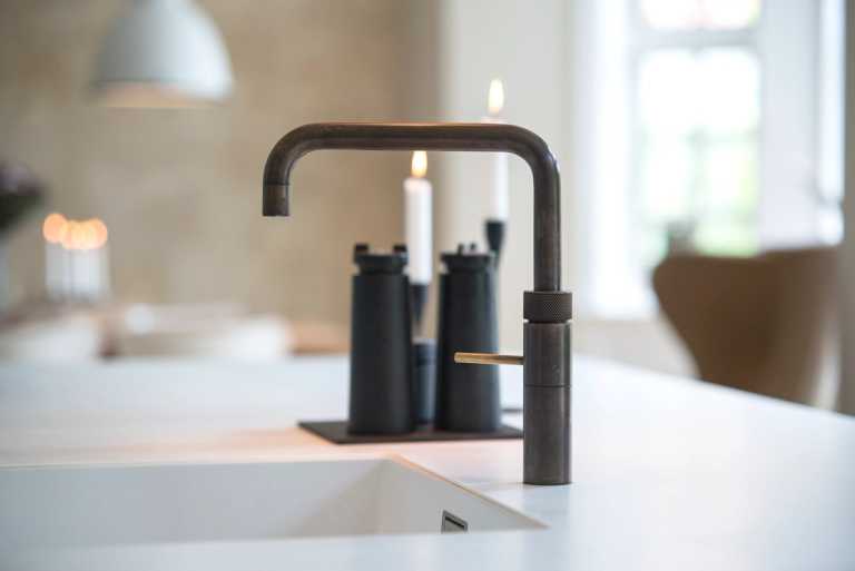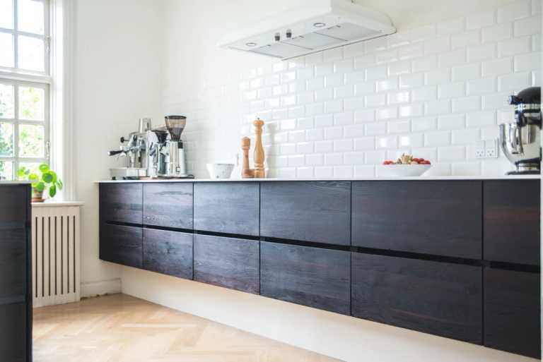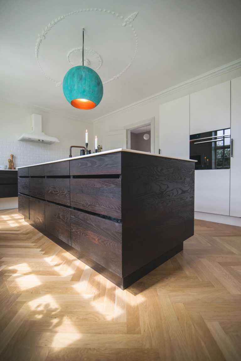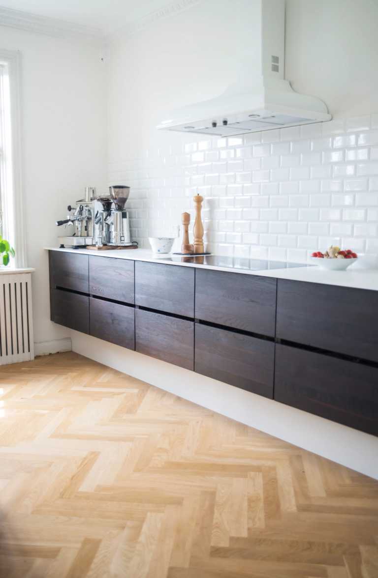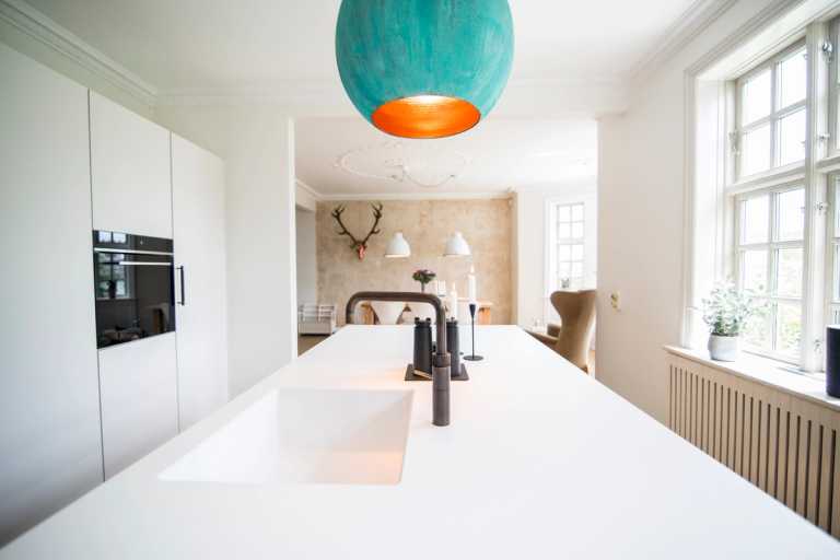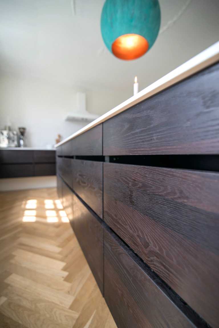 De mørke røget eg fronter til den hvide 12mm Corian bordplade giver et enkelt og rent look.
