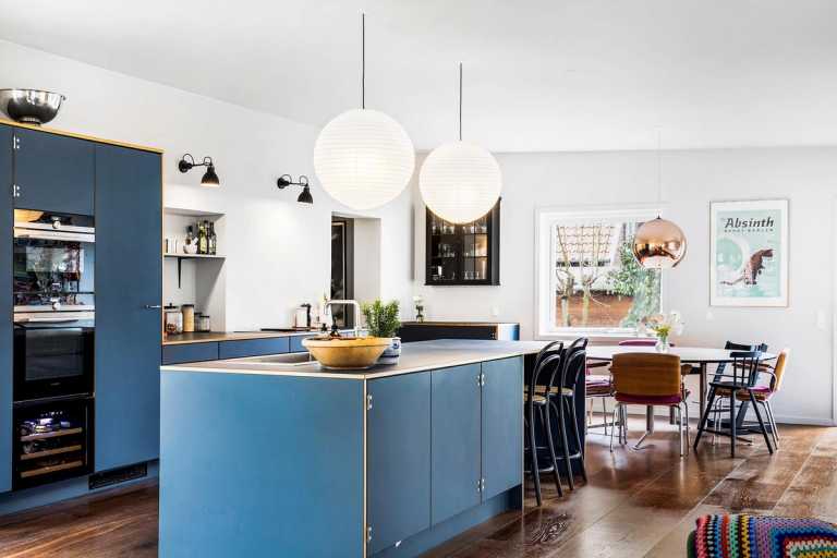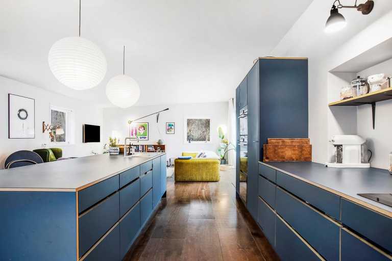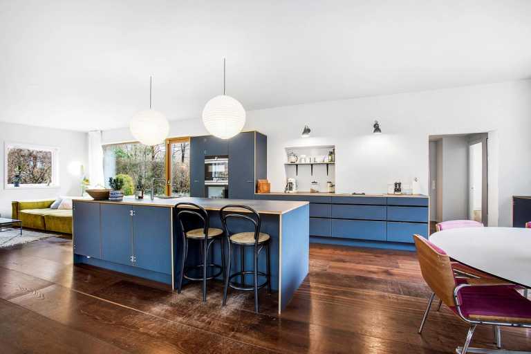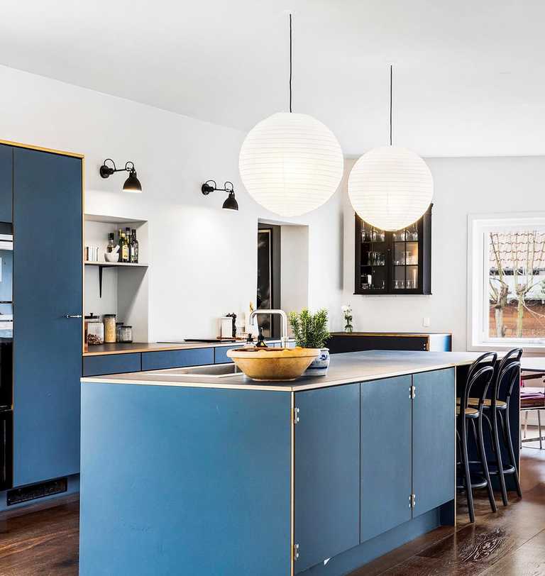 Køkken i Smokey blue linoleum med indlagte massive egetræs lister
