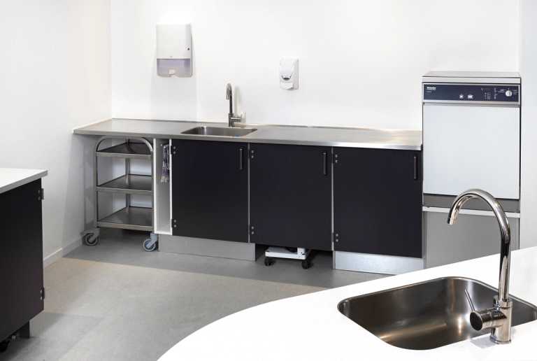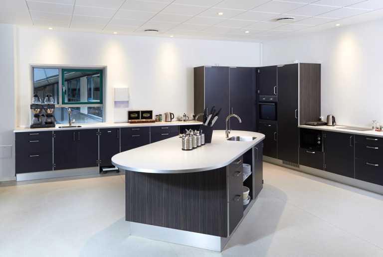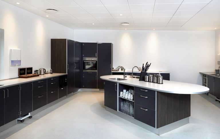 Køkkenet er designet så flere mennesker kan bruge køkkenet på en gang, da der her er tale om en arbejdsplads.