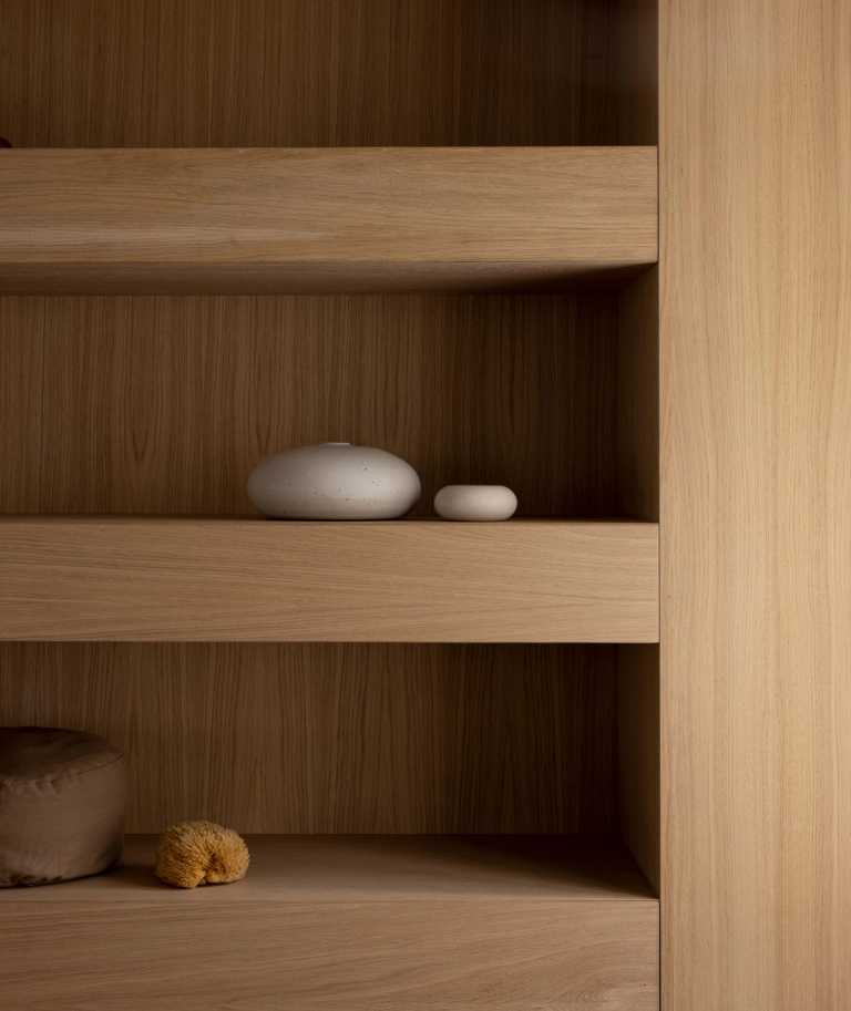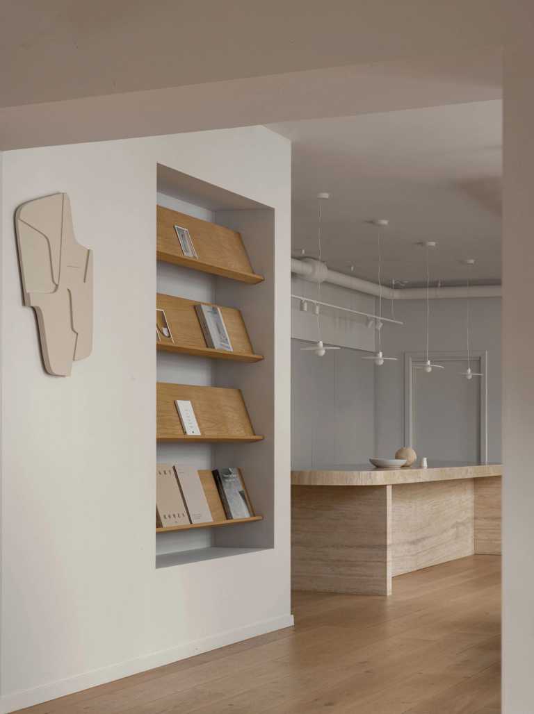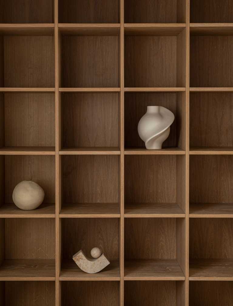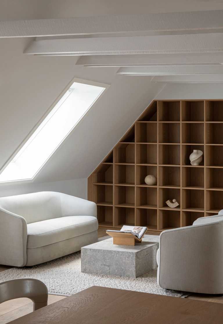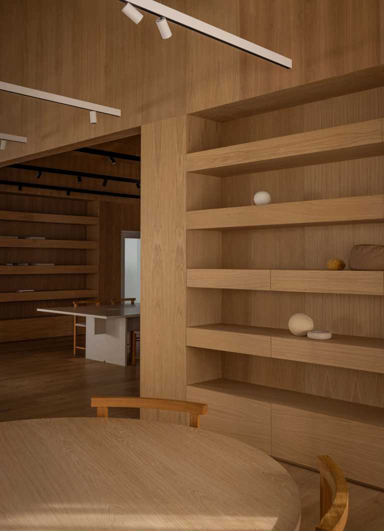 Huset i huset, er en kerne i deres showroom der er beklædt med egetræ og løsninger med hylder og skuffer.