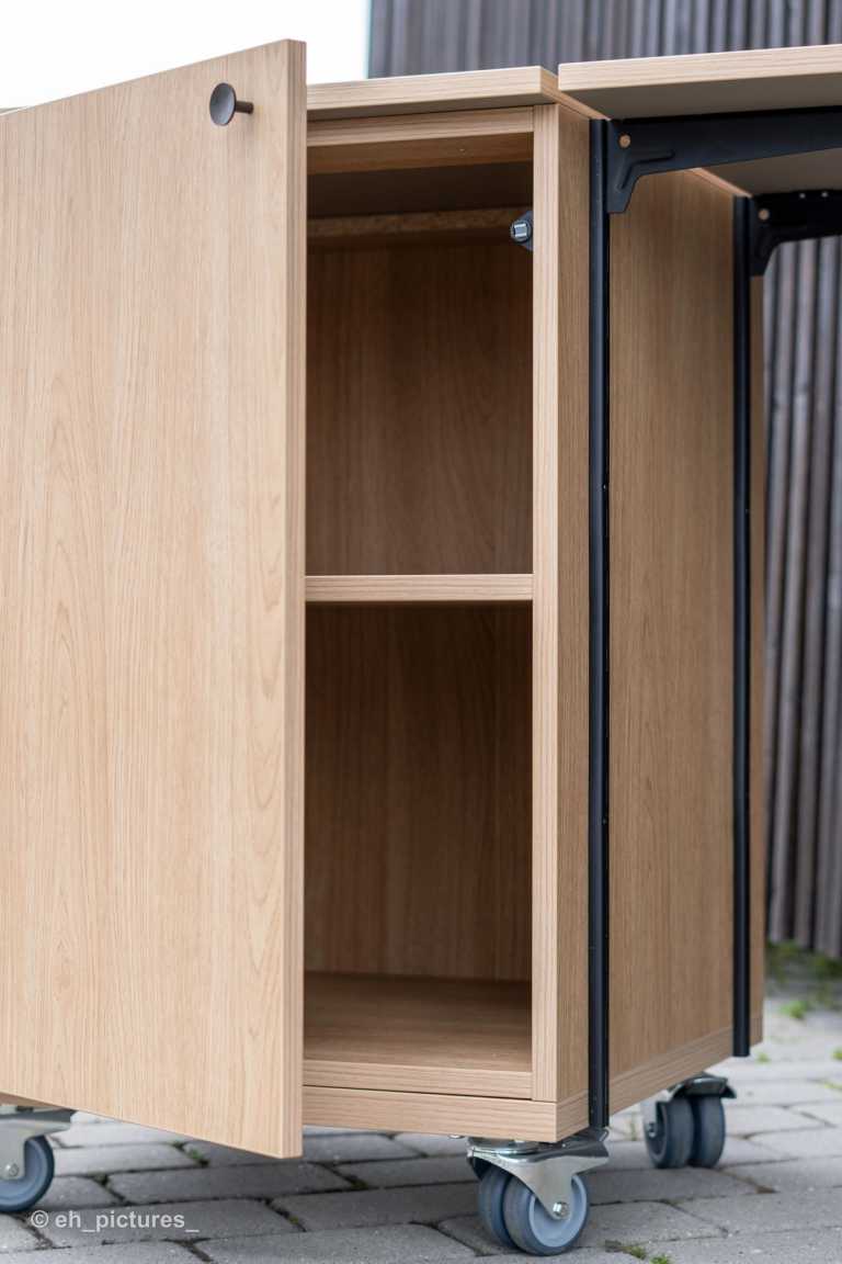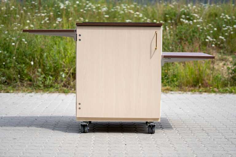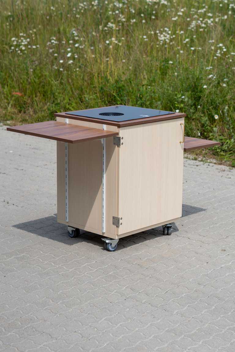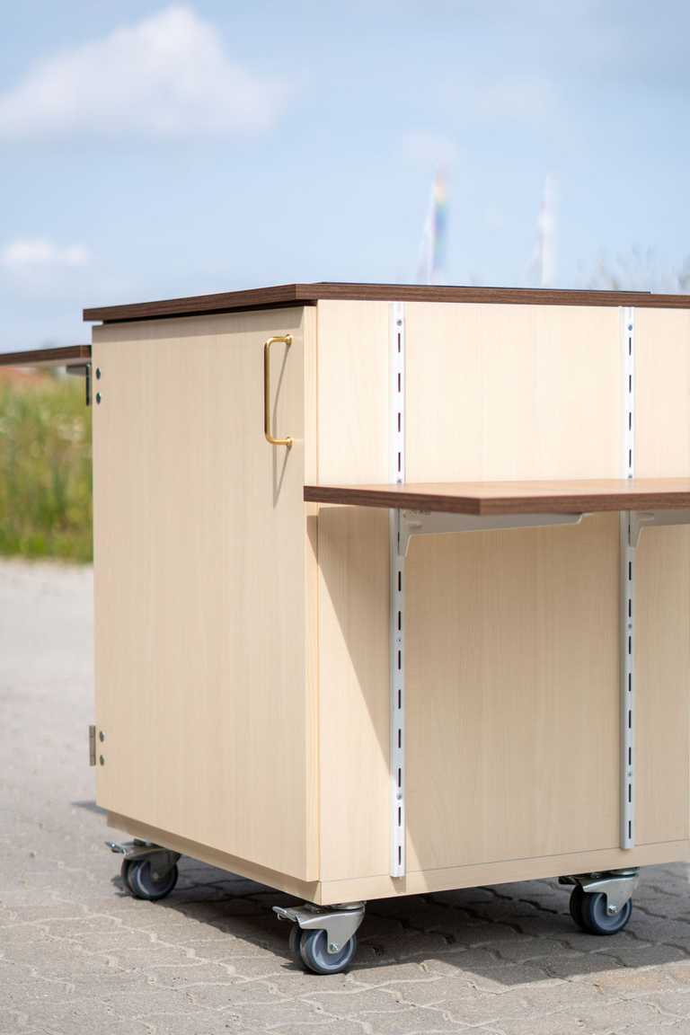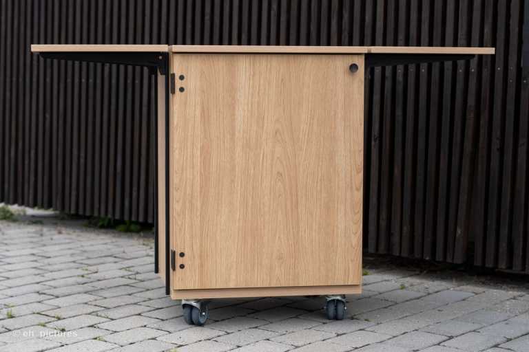 Dette mobilskab er en nytænkning af et traditionelt køkken i en ændrebolig. Her er mulighed for at rulle skabet med kogeplade og sug ind til beboeren.