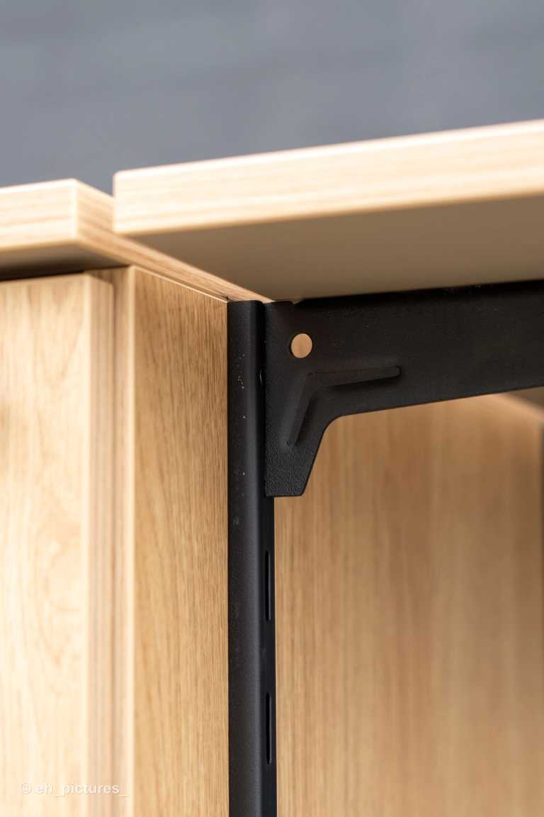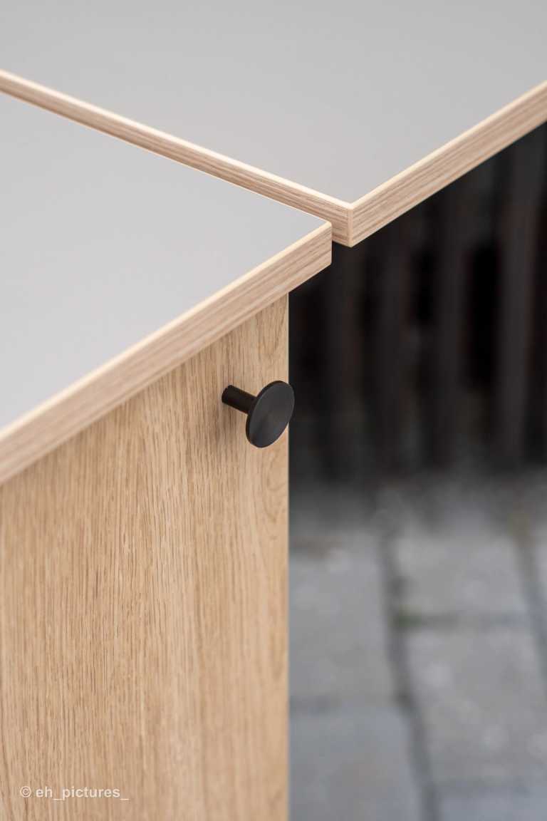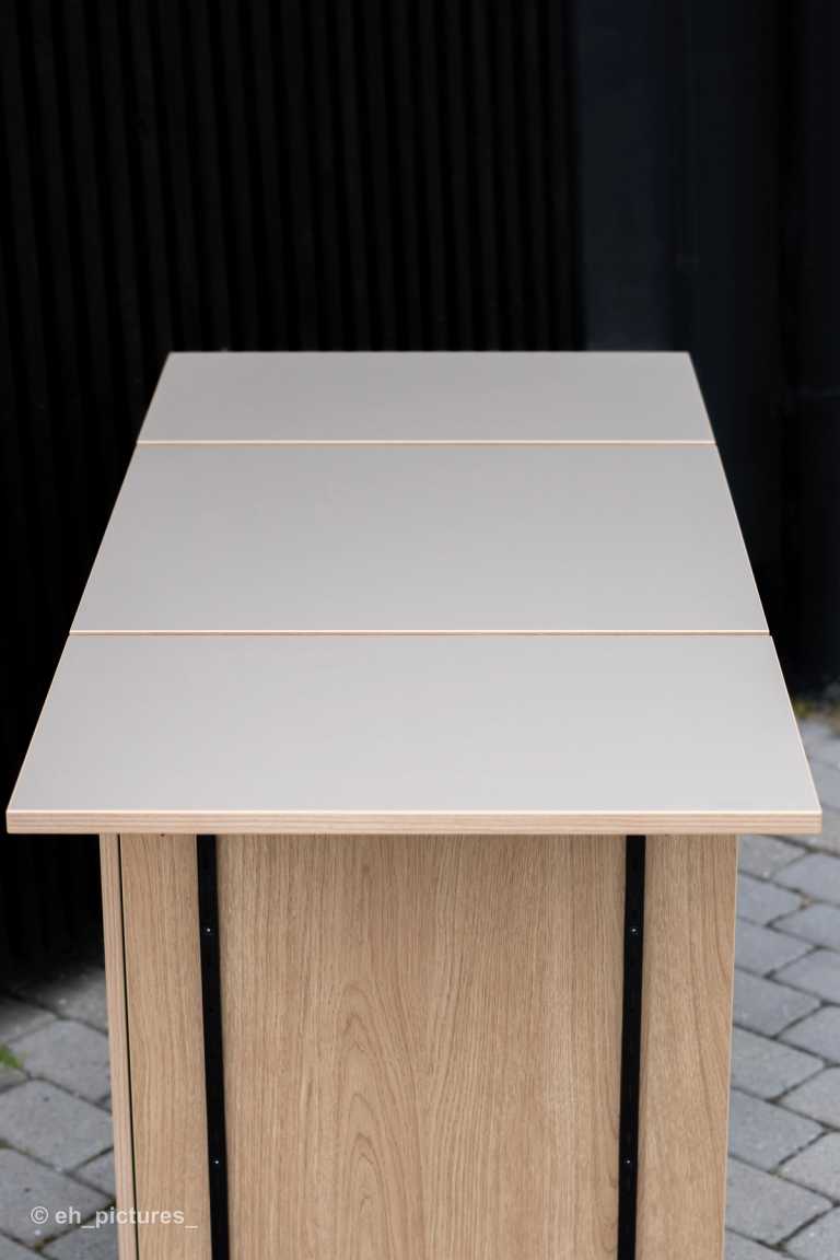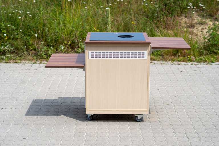 Dette mobilskab er en nytænkning af et traditionelt køkken i en ændrebolig. Her er mulighed for at rulle skabet med kogeplade og sug ind til beboeren.