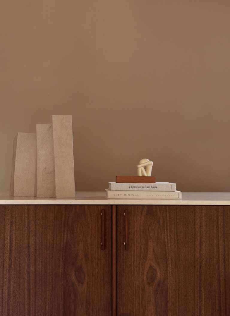 Fronter er i valnød med brun olie, bordpladen er 20mm Crema Marfil marmor.