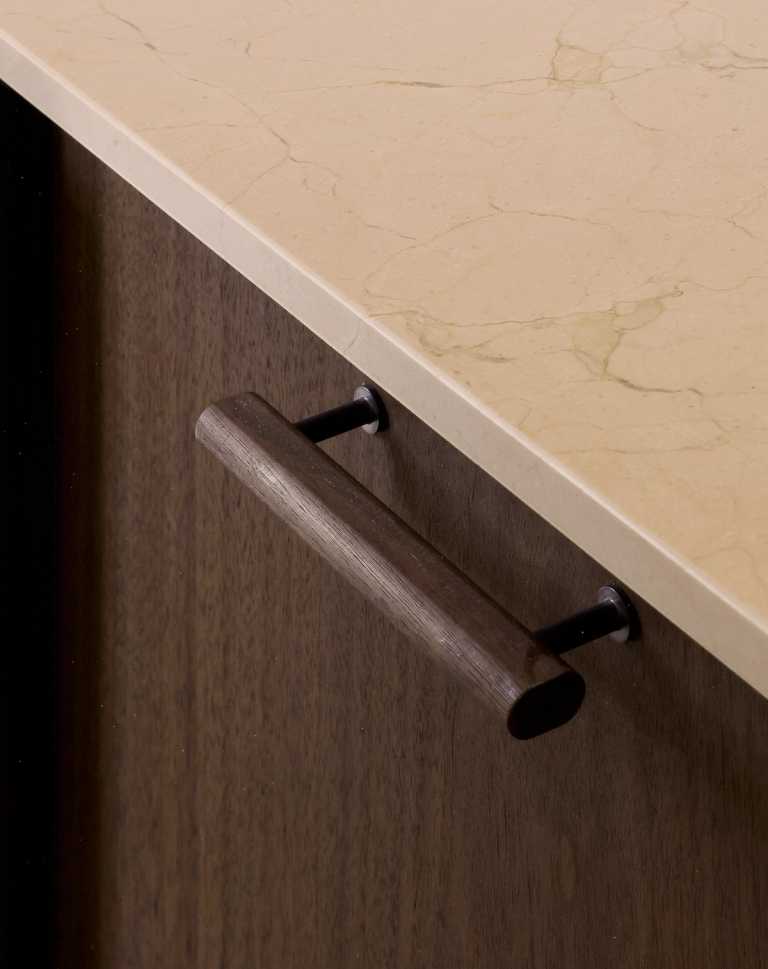 De fremskudte gavle er med afrundet kant, hvilket matcher de afrundet greb. Greb er specialdesignet og findes i valnød og eg og i kombination med messing og bruneret messing.