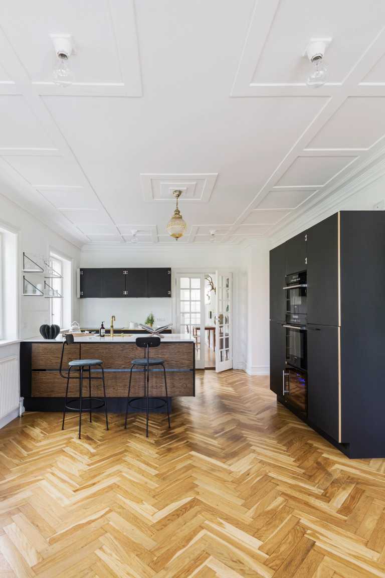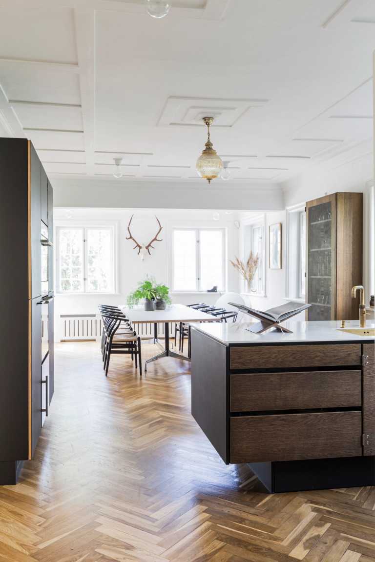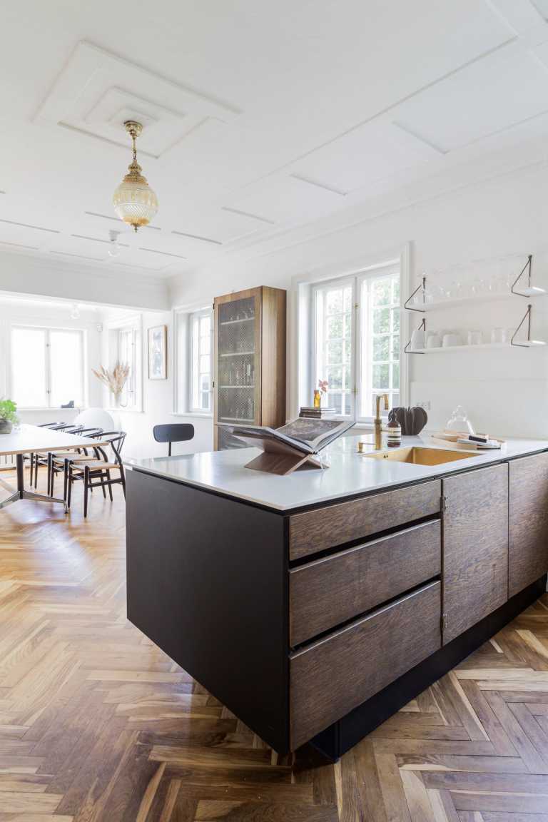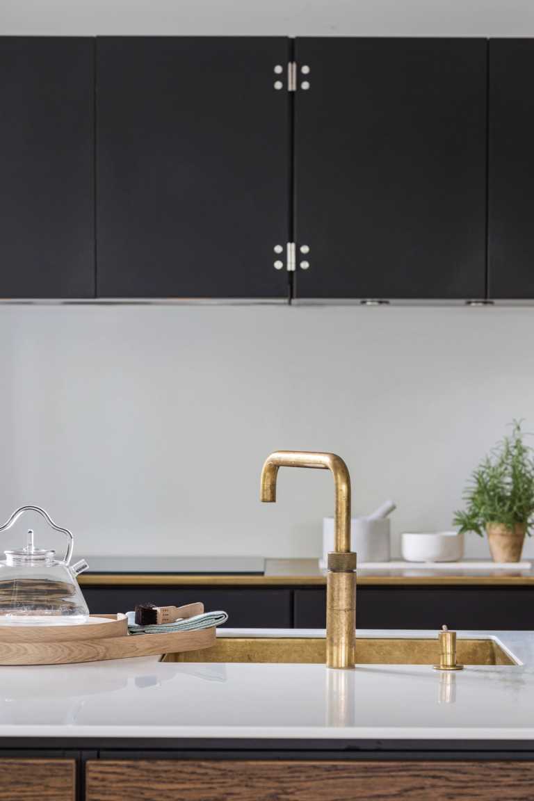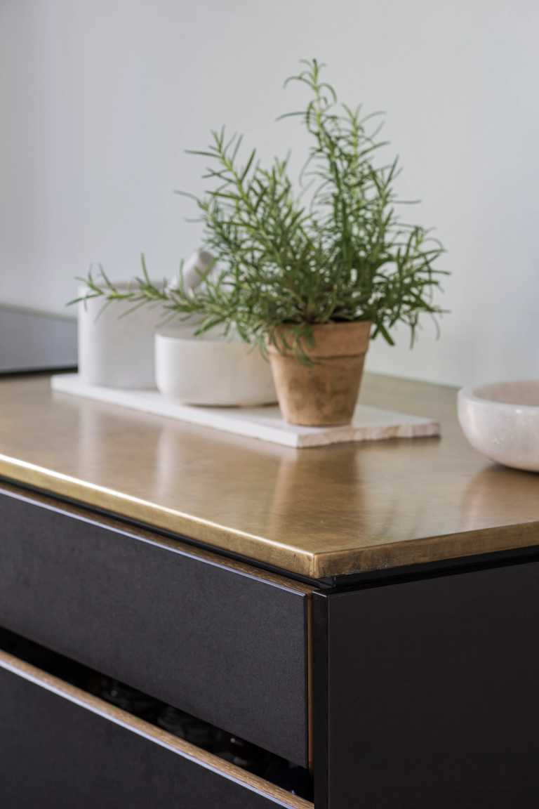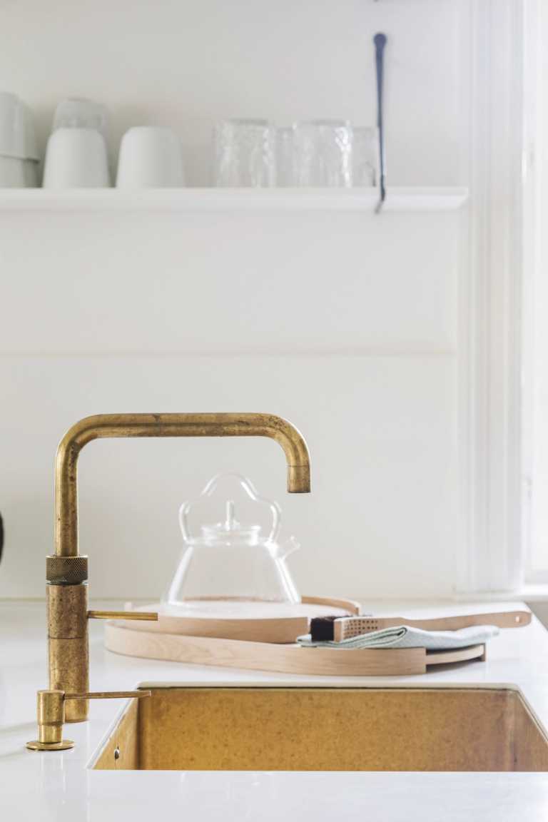 Bordplade, vask og Quooker er i natur messing der patinerer flot med tiden.