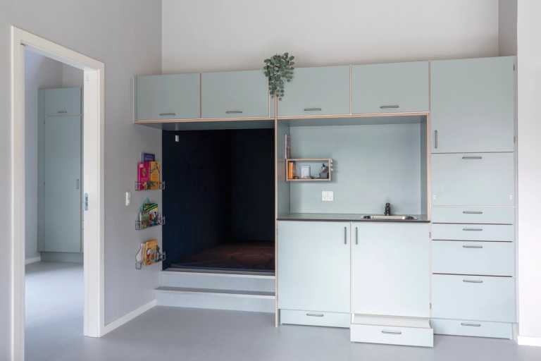 Børnegarderober, Kolon pusleborde, taskeskabe, tekøkkener til stuer med integreret "hule".