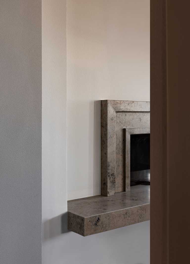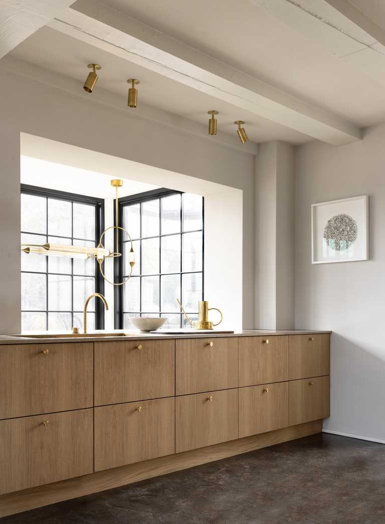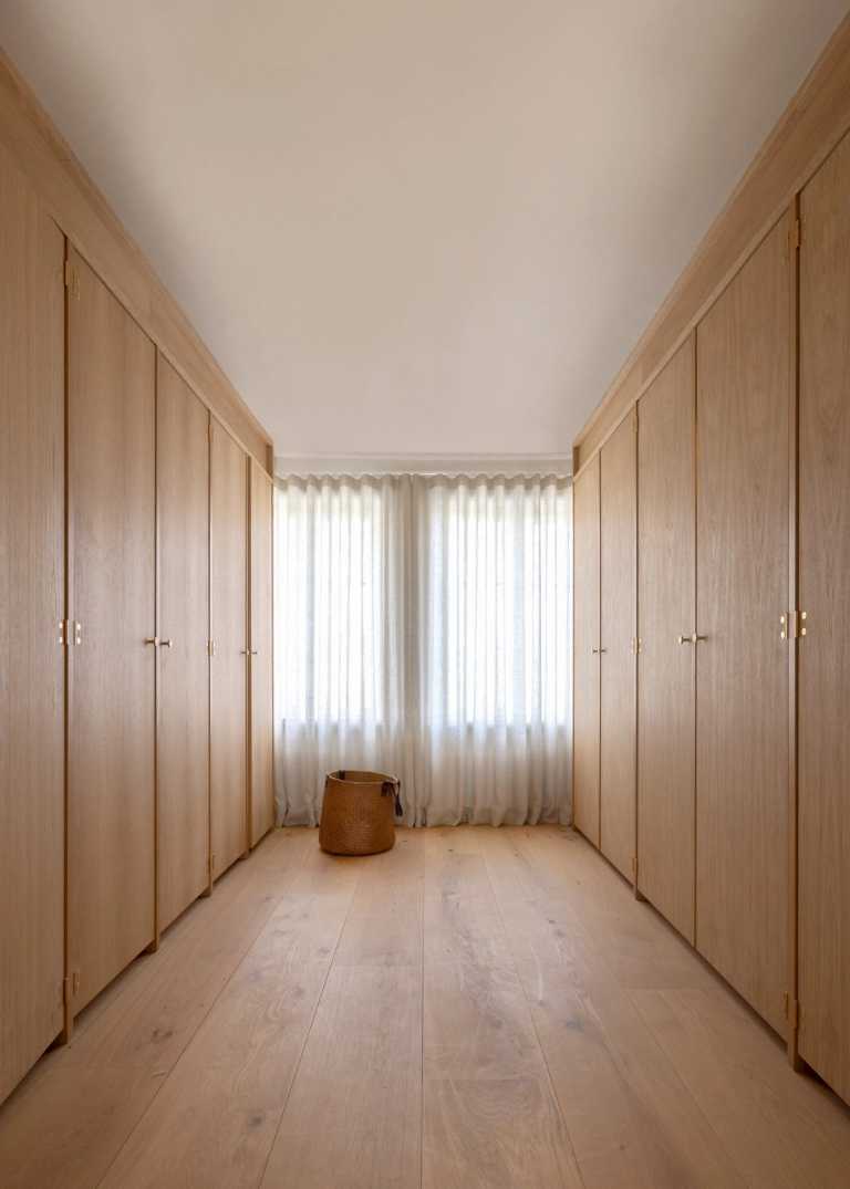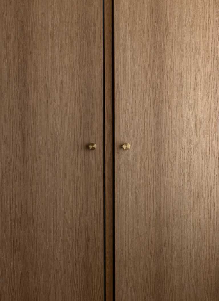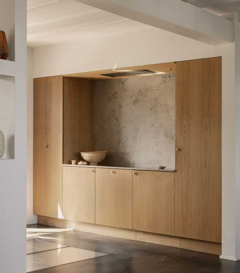 Egetræ og Jura Grau marmor er et gennemgående materiale valg til Køkken, vinkøkken, badeværelse og garderobe.